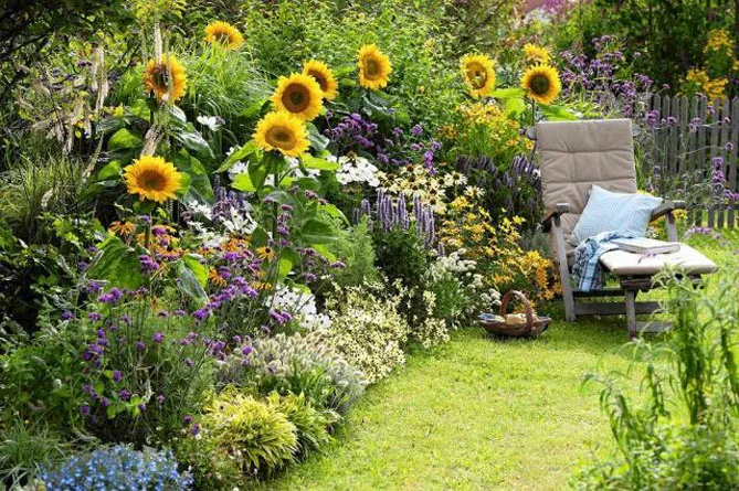 На великій клумбі великі пучки жовтих соняшників будуть сяяти до перших заморозків, оточені іншими квітами, які сховають основу його високих стебел:
