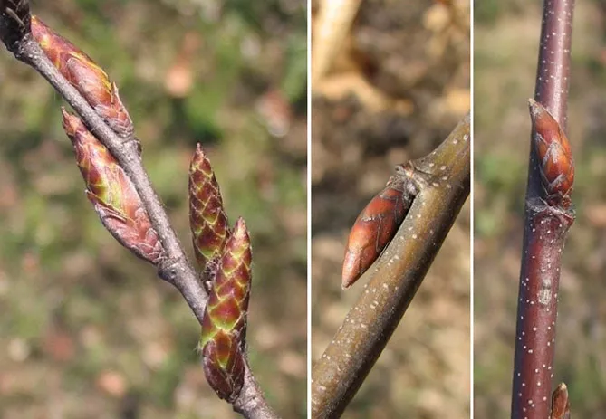 Бруньки вузько яйцеподібні, загострені, вкриті численними лусочками світло-коричневого кольору. Бічні бруньки щільно і часто косо прилягають до пагона, несиметричні, справляють враження вигнутих (зі сторони пагона прямі, ззовні випинаються). Квіткові бруньки набагато більші за листові.