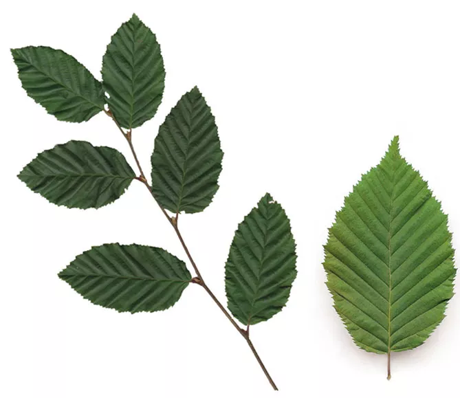 Листя граба пластинчасте, одиночне, у молодості у них є перетинчасті приквітки, які опадають незабаром після того, як розвинуться. Пластинка листа еліптична, завдовжки 5-10 см і завширшки до 6 см, з округлою або злегка серцеподібною основою, гостро-зубчастим краєм і гармонійно загнутою поверхнею, матово-зеленого кольору, має 10-15 пар прямих нерозгалужених бічних жилок, добре помітних з обох сторін, знизу злегка вкритих мохом.