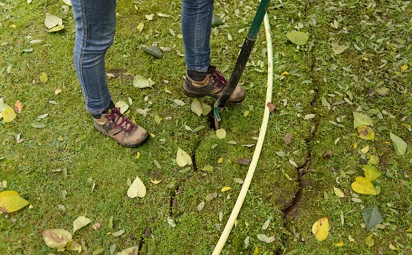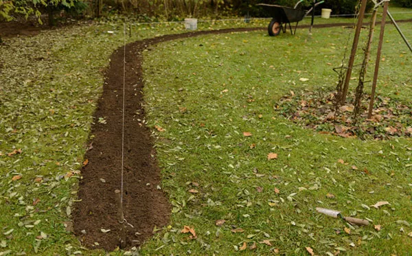 - Розмічаємо лінію огорожі. Почнемо з розкладання, наприклад, садового шланга, мотузки. Пройшовши вперед і назад кілька разів, потрібно переконатися, що лінія огорожі виглядає саме так, як потрібно. Якщо огорожа має бути посаджена по прямій лінії, можна відразу викласти її мотузкою.