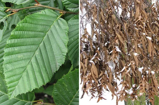 - Темно-коричневі овальні плями на листках означають появу гриба Gloeosporium carpini, який зимує на опалому листі і викликає глеоспоріоз. Для профілактики грибкових інфекцій потрібно видаляти опале листя, а уражені рослини оприскувати фунгіцидами.