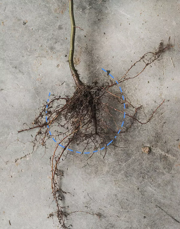 - Підріжте коріння. У більшості випадків коріння занадто довге. Іноді саджанці продаються з уже обрізаним корінням. За фото нижче видно, що у цього саджанця в минулому сезоні була обрізана частина коренів – видно укорочений стрижневий корінь, і з нього виросли нові молоді корінці. При обрізці пам’ятайте, що найменші коріння – найцінніші, вкорочуємо настільки, наскільки це необхідно. Інші зрізаємо навпіл – вони повинні вільно поміститися у лунці.