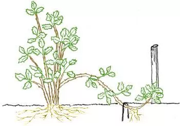 - Закопайте частину пагона з 3-4 бруньками для вкорінення. Для цього закріпіть його дерев'яним гачком (див. фото), потім заповніть борозну землею. Кінець пагона не закопуйте.