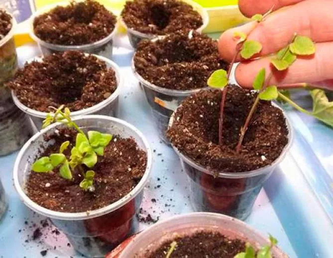 Молоді саджанці можна переносити в сад або в цільові контейнери, коли у них буде кілька справжніх листків (перші два листки називаються сім'ядолі, наступні – справжні).