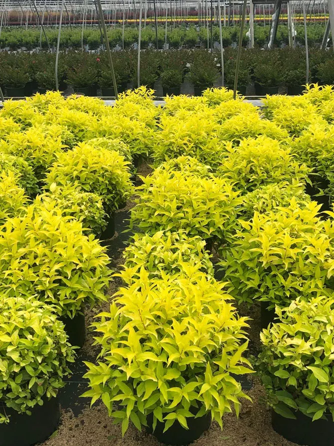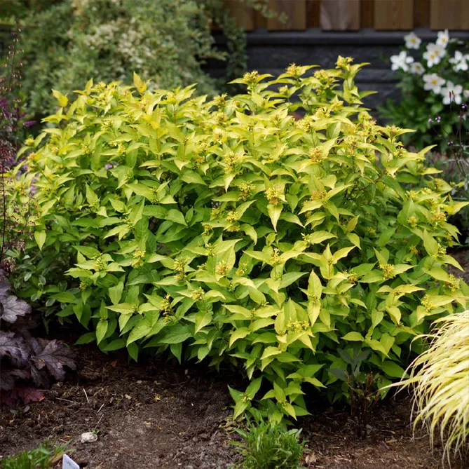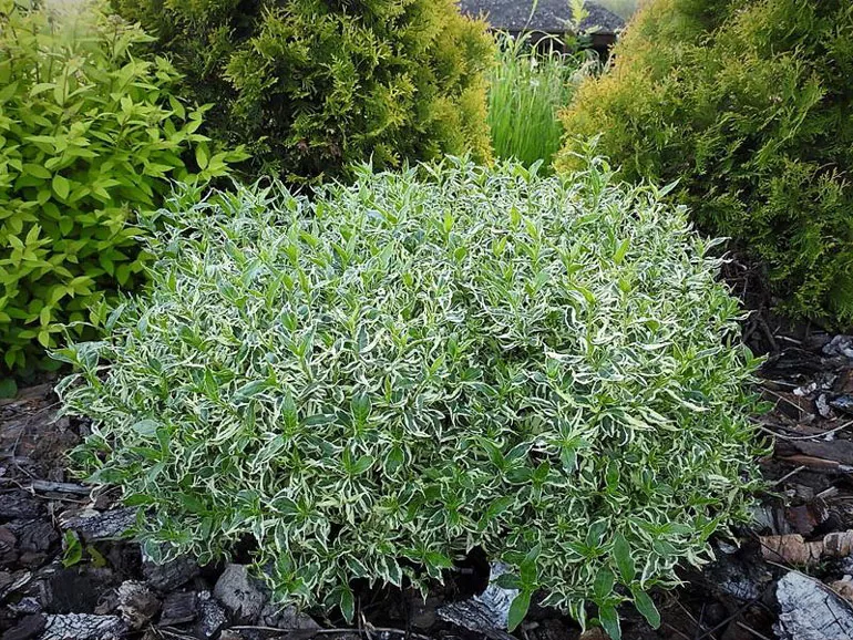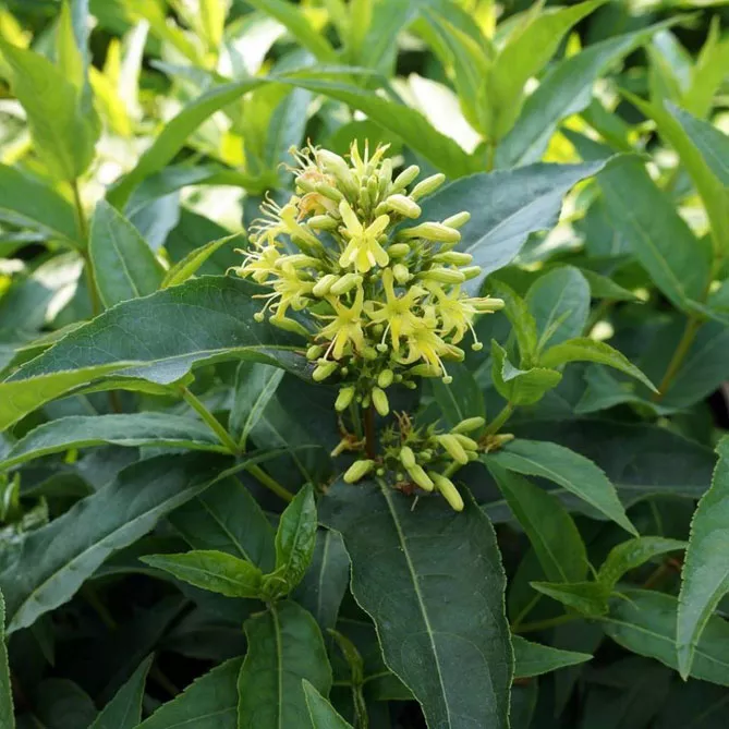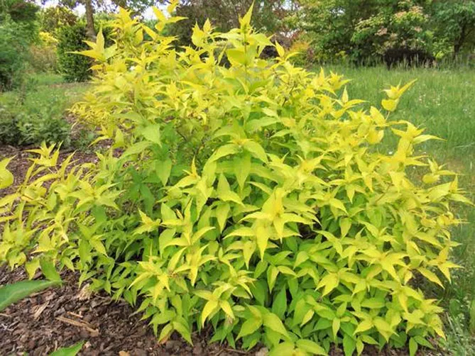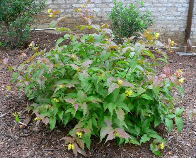 Дієрвілла блискуча (Diervilla splendens) цвіте у липні-серпні. Висота дорослого куща – 1,2 м. Цей гібрид садового походження з розлогим габітусом, що досягає 2 м у розмаху, є ідеальною ґрунтопокривною рослиною для сухих, затінених або помірно сонячних ділянок. Його гарне темно-зелене літнє листя стає оранжево-фіолетовим восени. Влітку на молодих пагонах з'являються китиці блідо-жовтих квітів. Кущ рясно цвіте навіть у тіні, де він особливо любить рости.