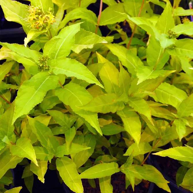 Дієрвілла струмкова (прирічна) «Ханібі» (honeybee) – рослина з яскравими жовтими листками, у молодому віці листя має мідний відтінок. Квіти спочатку жовті, по мірі цвітіння червоніють, зібрані по кілька штук у зонтики. Кущик невисокий – 70-80см, у ширину розкидається на 1 метр. Після того, як рослина добре розвинеться, вона утворює сильно розлогий кущ, який підходить для сонячних і напівтінистих експозицій та всіх ґрунтів.