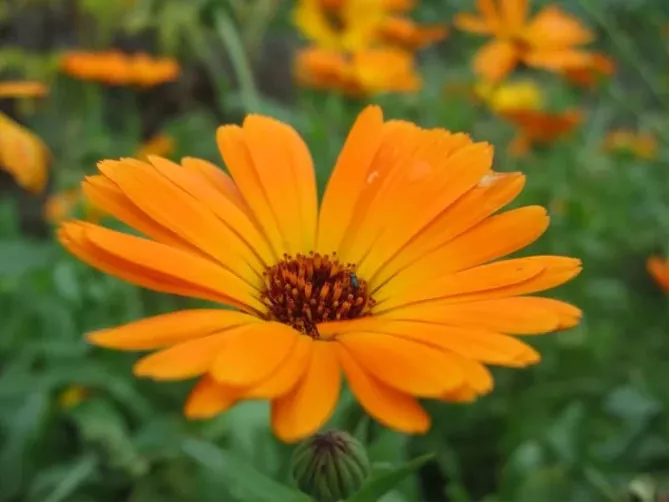 Квітка нагадує нагідки, але менша, м'якша, крихкіша. Цвіте з 3-ї декади червня до вересня. Суцвіття повністю відкриті тільки в сонячні дні, закриваються в похмуру погоду.