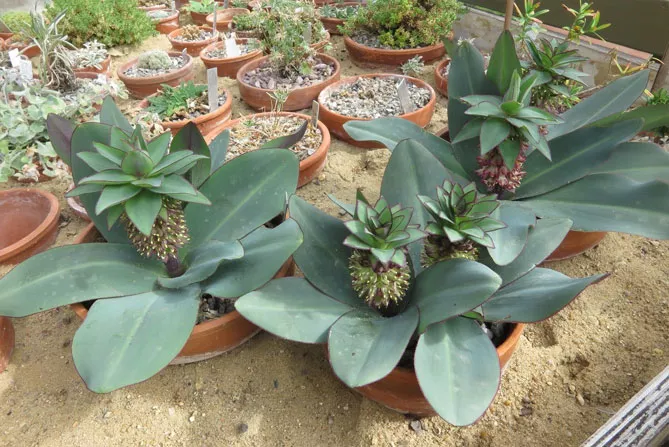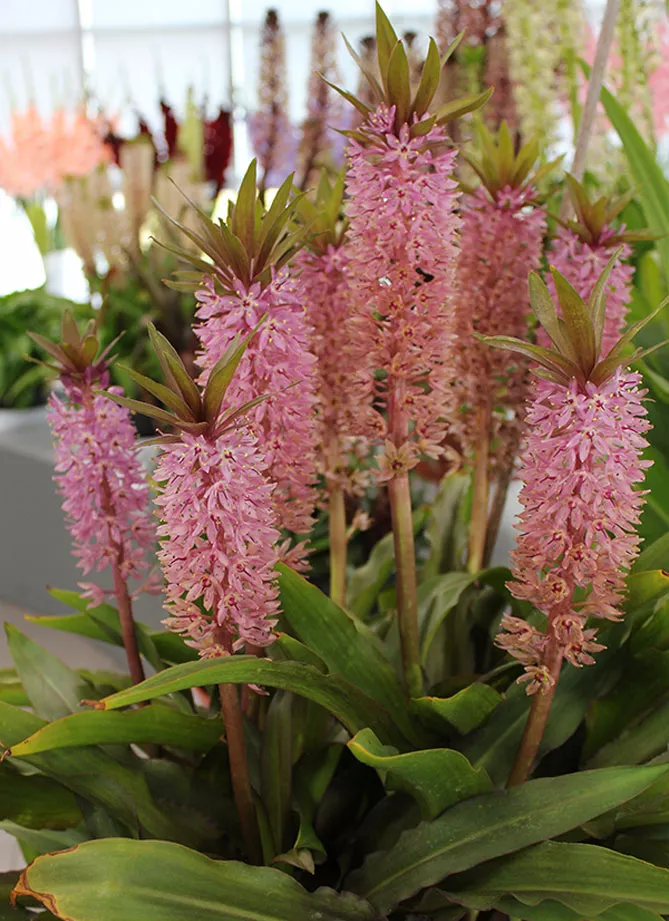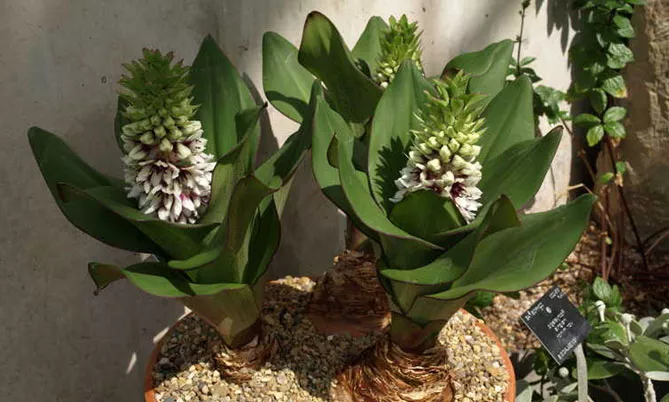 Вид Eucomis regia, що вирощується в горщиках у кімнатних умовах квітне взимку. Квіти від кремового до рожевого кольору, із зеленуватим відтінком, закінчуються зверху великим пучком листя.