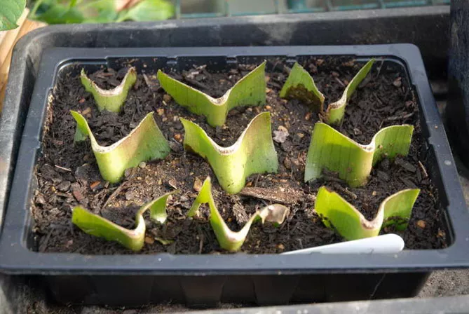 Перед початком розмноження еукоміса листовими живцями потрібно за 2 дні заздалегідь провести профілактичне оприскування рослини фунгіцидом. Вранці рослину поливаємо. Через 2 години можна взяти листок на розсаду.