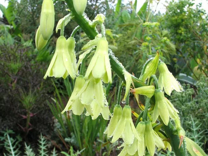 - Квіти: кремово-жовті дзвіночки, розпускаються з липня по вересень.