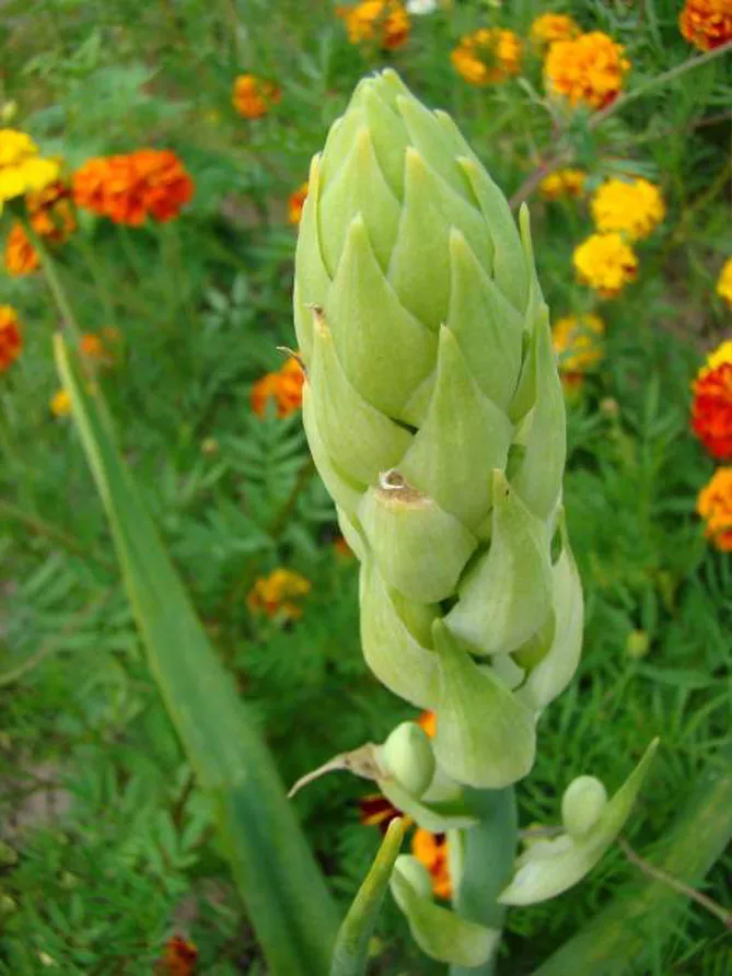- Квіти: циліндричний стебло, що закінчується гарним 30-сантиметровим колосом, який складається з 20-40 чисто-білих звисаючих квітів, злегка ароматних, воскових.