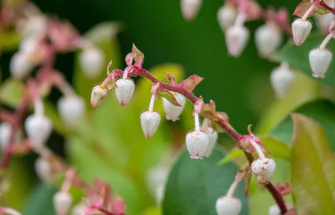 Пізньою весною гілочки рослини вкриваються дрібними рожево-білими квітами у формі дзвіночків. Рослини зазвичай дводомні, тому необхідно посадити поруч чоловічий екземпляр, щоб запилити жіночі, які дають ягоди.