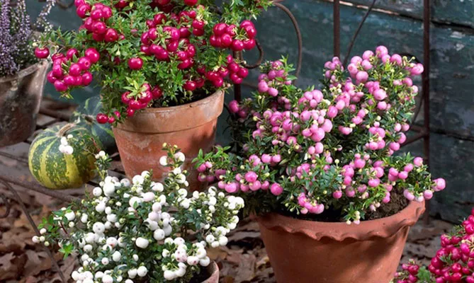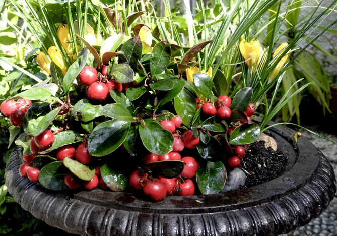 Гаультерію можна саджати у горщики для створення квіткових композицій. Можна комбінувати її з вересом та братками. Заповніть кашпо або кошик горщиковим ґрунтом, а потім посадіть рослини досить щільно.