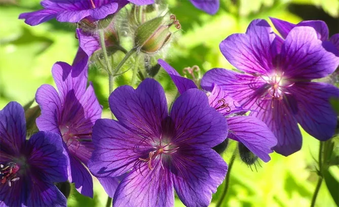 Висока герань лучна (Geranium pratense) досить велична, виростає до 50-80 см. До недавнього часу була звичайною лучною рослиною. Сьогодні частіше зустрічається у садах, її ніжні блакитні квіти прикрашають клумби з червня по вересень.