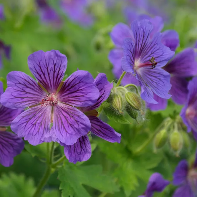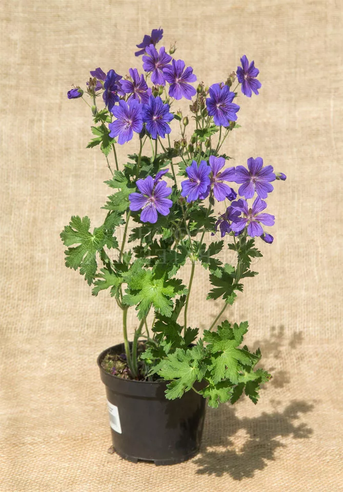 Герань гімалайська (Geranium himalayense) має розлогий кущ, але компактні розміри (до 30-40 см заввишки). Цвіте у червні-липні. Квіти з фіолетово-блакитними пелюстками, часто з фіолетовим центром. Краще росте на сонці та у напівтіні, переносить тінь. Вирощується у контейнерах, альпінаріях.