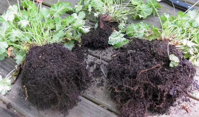 Герань легше розмножувати поділом. Її потрібно викопати та розділити (або гострою лопатою відокремити частину, не викопуючи цілком). Рослина має міцні, довгі корені, тому під час викопування можна сильно пошкодити їх. На щастя, корені легко відновлюються, і садженець вкорінюється. Розмноження герані поділом проводять навесні – з квітня до кінця травня.