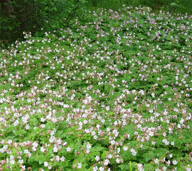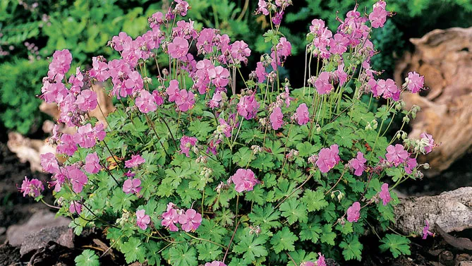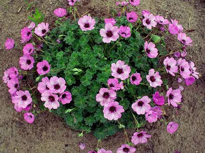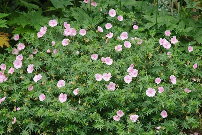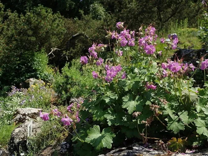 Герань далматська Geranium dalmaticum – досягає висоти 15 см, квіти блідо-рожеві, листя вічнозелене. Цвіте з червня по липень.