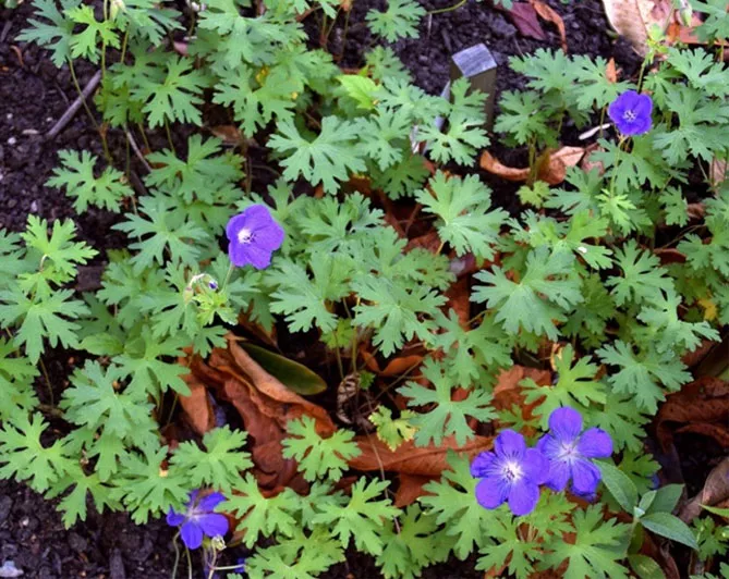 Ефектний вид – герань плосколиста (Geranium platypetalum) має великі фіолетово-блакитні квіти, виростає до 40-70 см у висоту. Цвіте пишно (травень-червень), потім повторює цвітіння. Восени листя гарно забарвлюється.