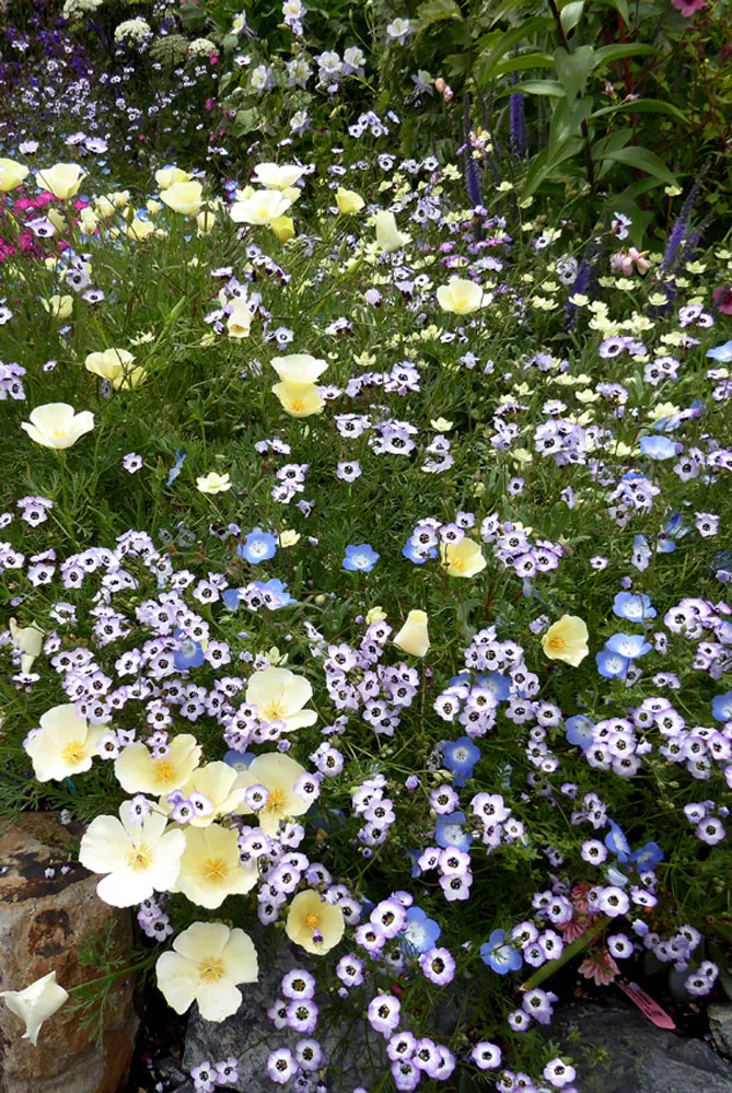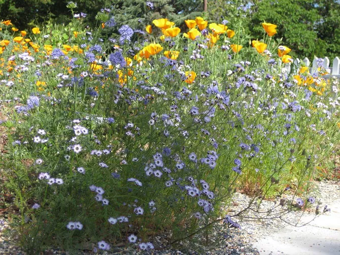 Гілія медоносна, корисна для біорізноманіття, приваблює безліч комах-запилювачів (метелики, бджоли).