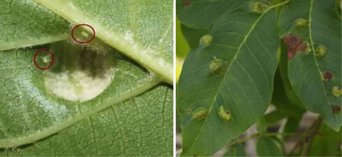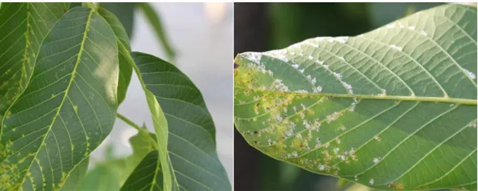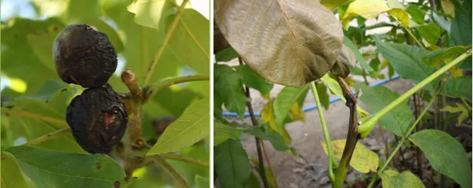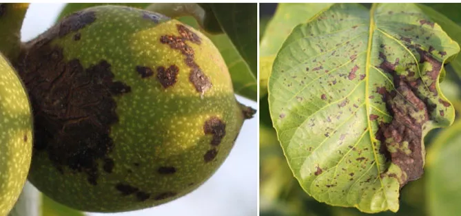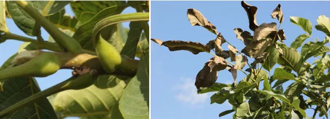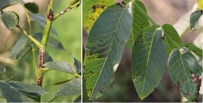 Фото. Бактеріальна гниль горіха (Xantomonas arboricola pv juglandis, синонім Xantomonas campestris pv juglandis) на листі, пагонах, плодах.