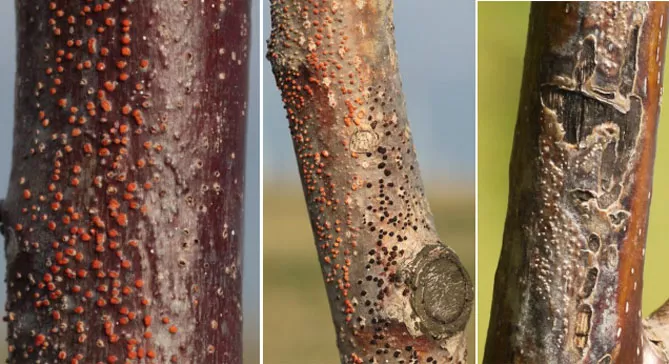 - Навесні заражені пагони не випускають листя або листя раптово засихає.