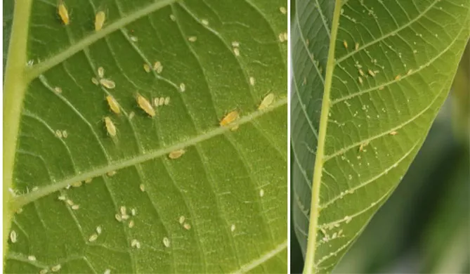 Тлі на горіхах поширені, але не в таких кількостях, як на інших плодових деревах. Зазвичай популяція цього шкідника в достатній мірі регулюється сонечками. Необхідність оприскування може виникнути у випадку молодих горіхів, після внесення великої разової дози азоту.