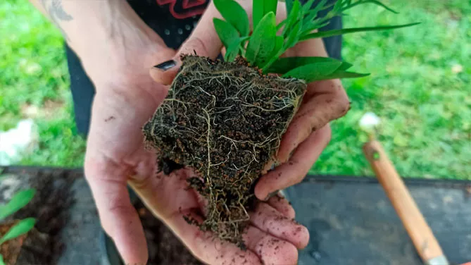 - Зробіть посадкову ямку, глибина якої дорівнює глибині горщика з саджанцем, а ширина в два 2 більше ширини кореневого кома.