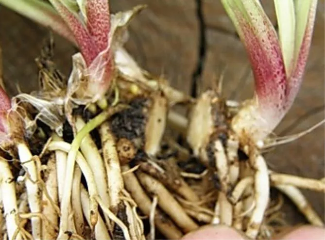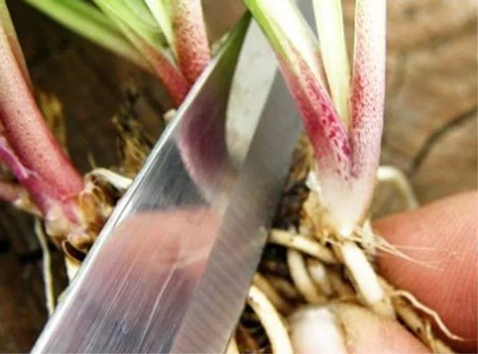 Розріз роблять неглибоко, щоб розділити лише частину, що з’єднує рослини, і не проводити непотрібне обрізування коренів. Коріння акуратно розділяють, завдяки цьому у рослини утворюється одна маленька рана.
