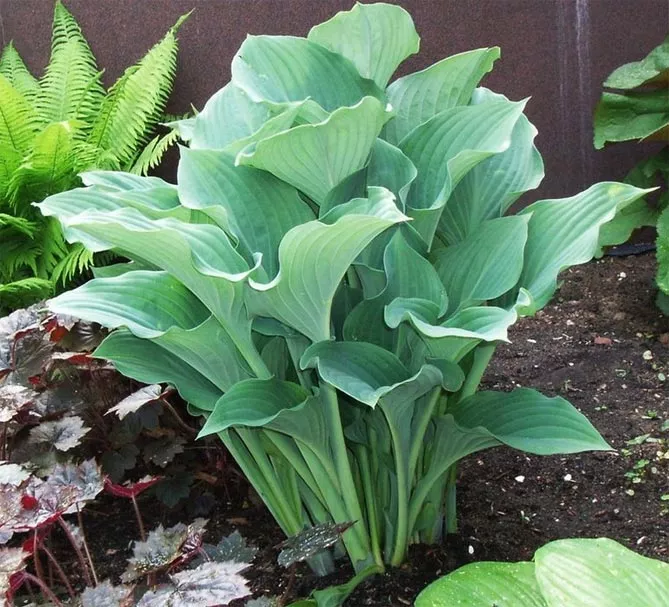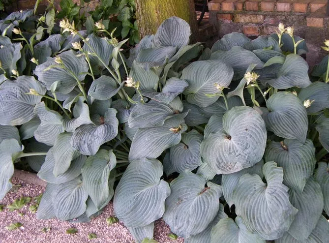 - Немає сортів із блакитним або синім листям. Усі листя зелено-блакитні (багато чого залежить від удобрення). Блакитний колір рослини отримують завдяки воску, який покриває листову пластинку. Для оцінки використовується спеціальна 5-бальна шкала. Наприклад, сорт «Халціон» (Halcyon) вважається синім і має рівень 2. Синій колір стає найінтенсивнішим навесні.