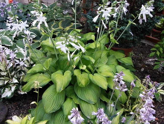 - Хости не захоплюють територію, але з кожним роком утворюють великі скупчення, з великою кількістю пагонів, аж до розмірів, зазначених у описі сортів.