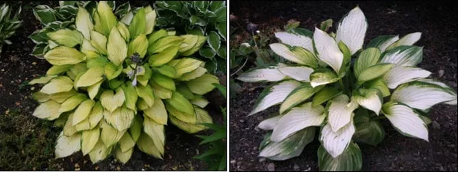 Фото. Хоста сорту «Голд Стандарт» (Gold Standard), що вирощується в напівтіні (на фото зліва), на сонці (справа).