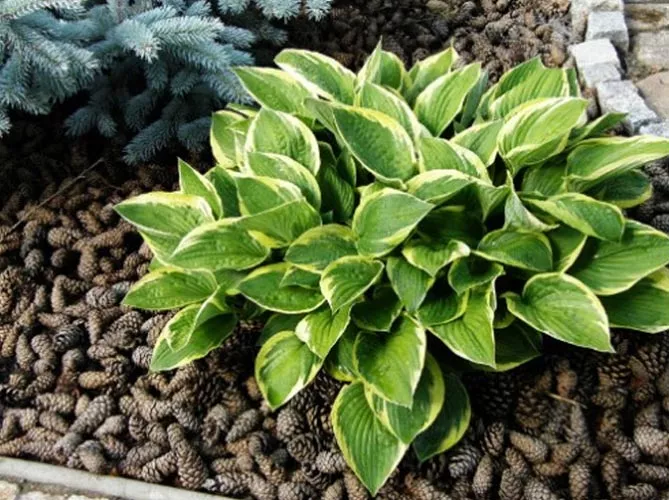 - Шишки, голки. При вирощуванні хости серед хвойних, цей натуральний та дешевий матеріал доповнює дизайн саду.