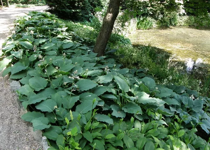 Сорти з листям із чітко окресленими прожилками чудово виглядають на краю садового ставка.