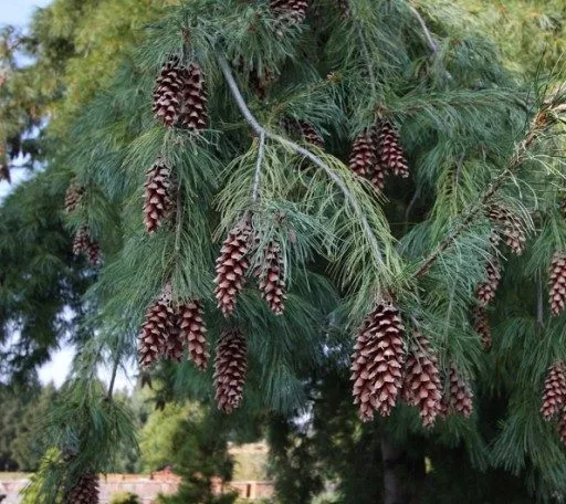 Шишки сидять на вершинах пагонів, пофарбовані у червоно-коричневий або жовто-коричневий відтінок. Вони досить великі (до 15 см завдовжки), овальні, відкриваються після дозрівання, мають колючі придатки. Цвітіння – наприкінці весни (квітень), насіння дозріває через 2 роки. Стійка до морозу, посухи, добре переносить забруднення повітря.