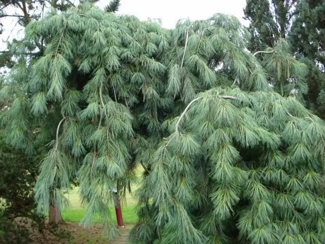 - Pinus strobus «Pendula» – унікальний, повільноростучий сорт. Широкі гілки, зігнуті у різні боки, що досягають кількох метрів у ширину. Прикраса плакучої сосни – довгі сіро-блакитні голки, 5 штук у зв'язці. Веймутка у результаті виростає до 10 м у висоту. Добре росте у садовому, гумусовому ґрунті. Виглядає гарно у групових насадженнях та автономно.