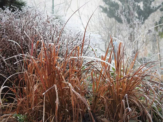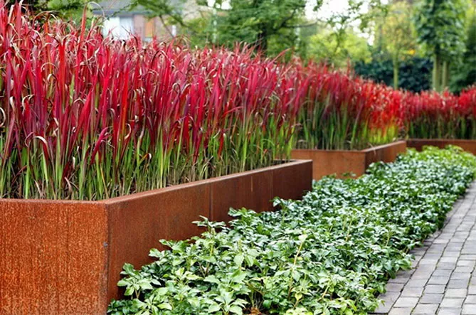 - Листя – червонувате, вузьке, довге, з гострими краями та кінчиком. Листя, яке робить траву унікальною на тлі інших популярних декоративних трав.
