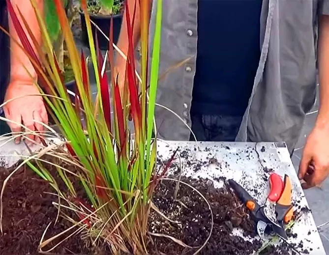 - Після цього вийняти траву і акуратно укоротити коріння, попередньо видаливши зайвий ґрунт. Так ми стимулюємо рослину випускати нове коріння і збільшуємо ймовірність того, що вона добре приживеться. Також необхідно видалити сухі, пошкоджені пагони. Важливо не лише дбати про гарний зовнішній вигляд рослини, але й не піддавати її ризику виникнення хвороб.