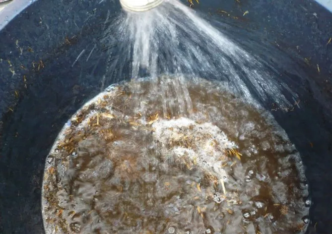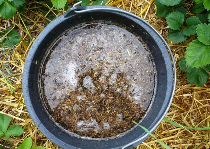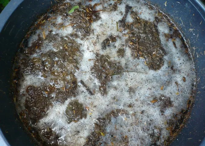 - Ферментація. Процес ферментації починається через кілька днів. Швидше – коли тепло, повільніше – коли прохолодно. Легко дізнатися, що бродіння триває: на поверхні утворюється піна. На цьому етапі рано використовувати підгодівлю. Доведеться почекати кілька днів. Якщо після перемішування паличкою піни більше не буде або з'являться лише окремі бульбашки, розчин посліду готовий до використання. Тепер його потрібно розвести (див. Пункт 3).