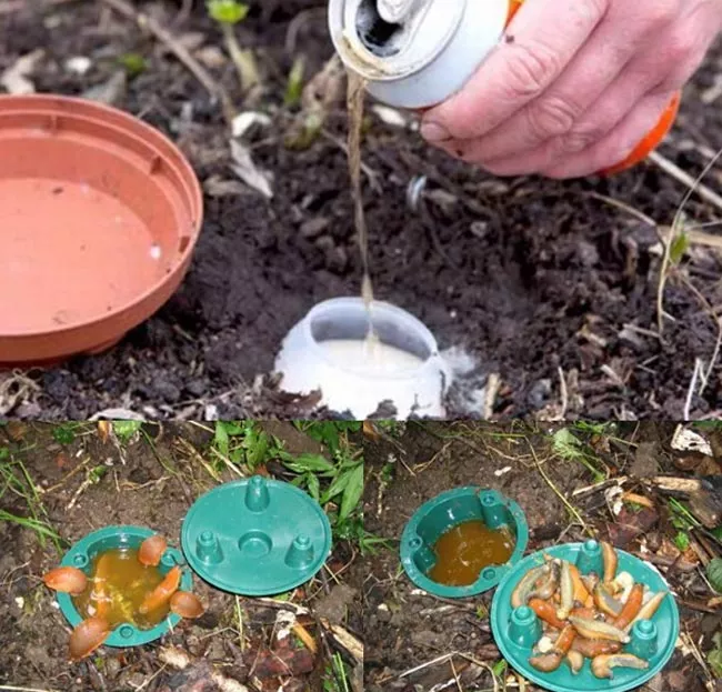- цікава ідея – вкопати в землю контейнери, що містять пиво, яке виступає частуванням равликів; контейнери необхідно використовувати великі, щоб равлики потонули в них.