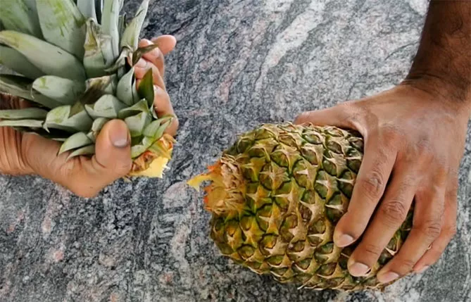 - Відкрутити корону. Ананас міцно фіксують однією рукою, іншою беруть чубок біля основи листя, повертають убік. Плід трохи відтягують, щоб операція пройшла швидше. Зазвичай, щоб корона відокремилася, достатньо чверті оберту. Пучок листя має сидіти на циліндричній волокнистій серцевині.