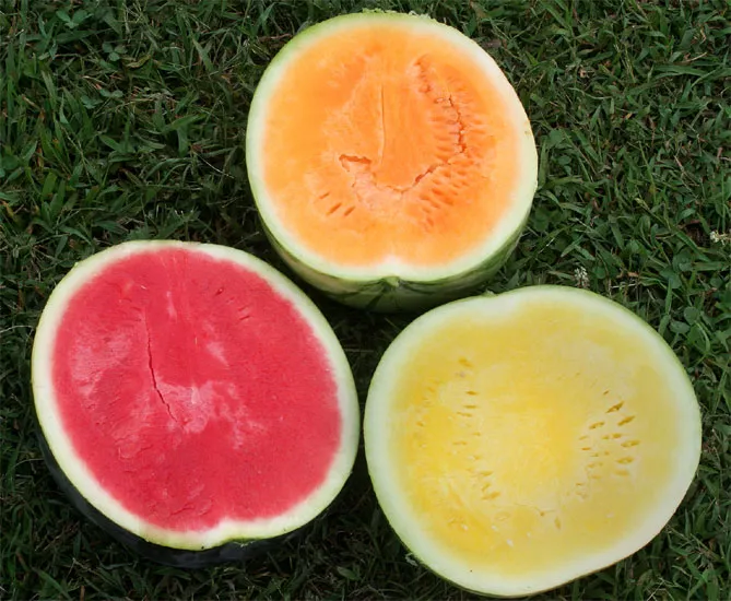 Плід кавуна – псевдоягода, форма якої варіюється від круглої до овальної та еліптичної. Їстівна м'якоть всередині плоду. Її колір може бути червоним, рожевим, жовтим.