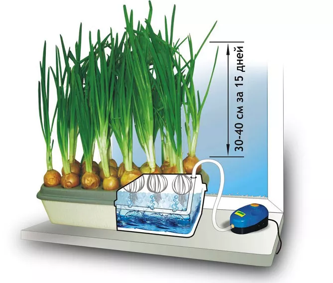 Для тих, хто любить у холодний зимовий час поласувати смачною зеленою цибулею, існують різні пристосування. Їх дії засновані на гідропонічному принципі: ємність заповнюється водою, у отвори вгорі кладуть цибулини, причому нижньою частиною вони не повинні контактувати з водою. Завдяки спеціальному компресору всередині лотка для вирощування утворюється вологий туман. Це дозволяє виключити ризик гниття коріння. На думку фахівців, при такому методі вирощування зеленої цибулі вдома на підвіконні перья ростуть набагато швидше, ніж при використанні інших способів.