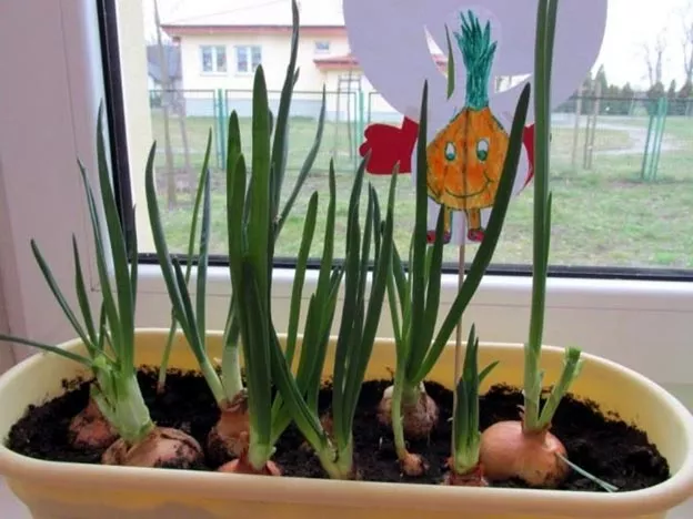 Ємність із посадженою цибулею має зберігатися один тиждень у теплому місці. Після утворення зелених паростків контейнер встановлюють на підвіконні – бажано на південне вікно. Потрібно стежити, щоб земля не пересихала. Зрошення має здійснюватися через день – цього цілком достатньо для живлення цибулини і нарощування зелених перыць, які з'являться через 14-21 день.
