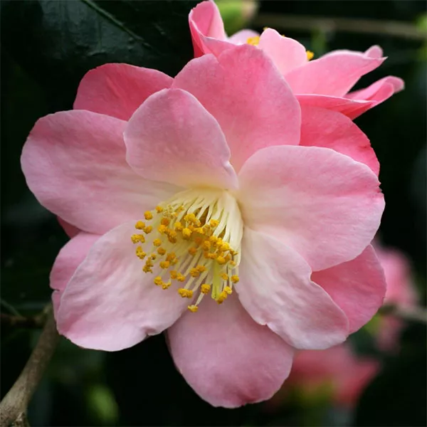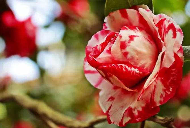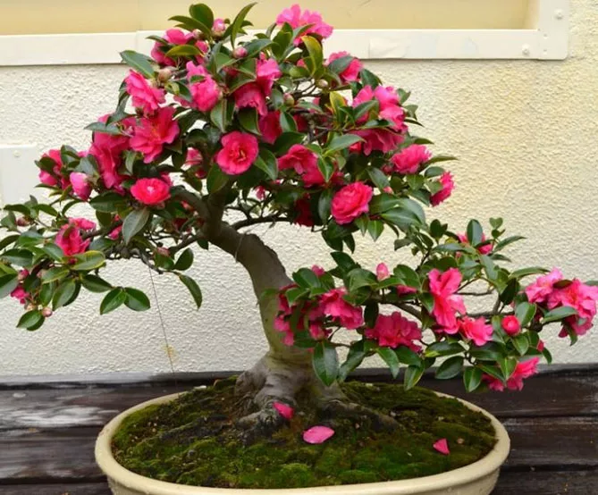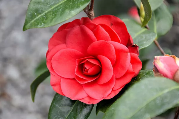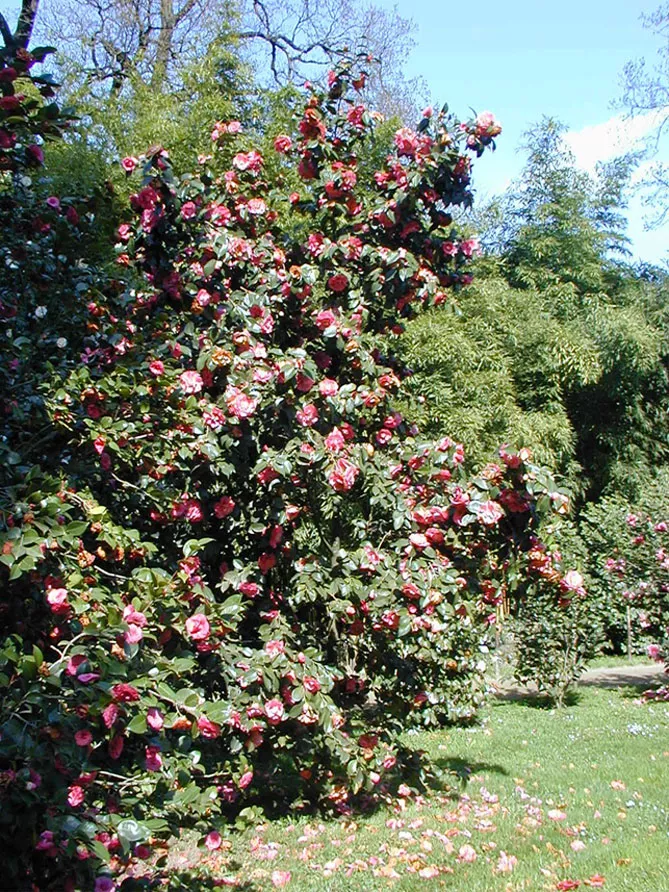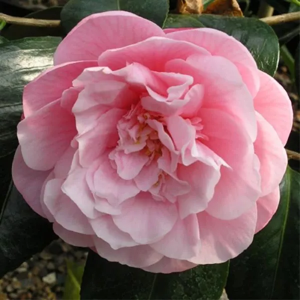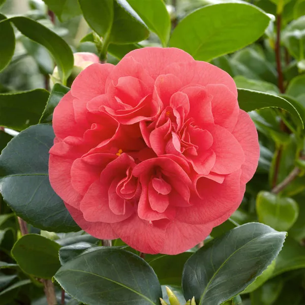 Камелія садова японська (Camellia japonica) – вічнозелений чагарник або дерево, досягає 1 метра в домашніх умовах і до 10 метрів в природних умовах у теплому кліматі. Молоді пагони світло-коричневі, старі пагони камелії деревовидні, коричневі, з відтінком пурпурного кольору.