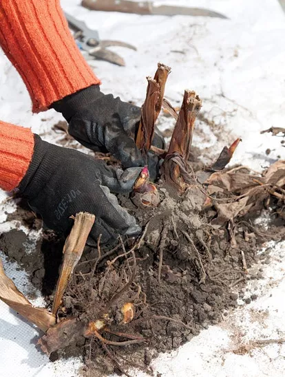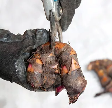 - Коли перший мороз прихопить листя, зріжте їх гострим ножем на висоті 10-15 см від землі. Великою лопатою або вилами, акуратно викопуємо кореневий ком.