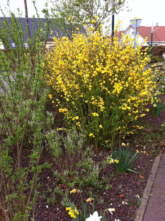 У квітучій живій огорожі керія стане ідеальним компаньйоном для кущів, що цвітуть раніше або пізніше, для подовження декору саду: