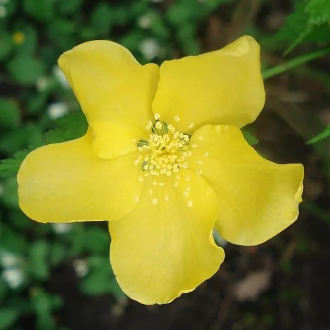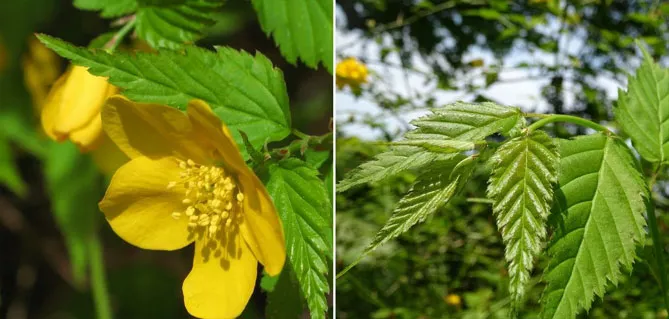 Фото. Світла дрібнозубчаста листва і одна квітка керії «Золота Гвінея»