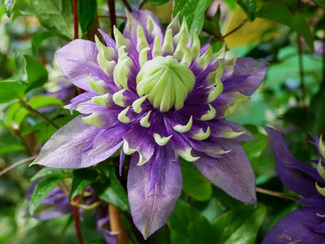 Цей клематис – справжній твір мистецтва, він дійсно унікальний. Цвіте з літа до осені великими, махровими квітками. Брунька розкривається поступово, у вигляді вигнутих пурпурно-блакитних пелюсток, що закінчуються зеленими кінчиками. Різнобарвність квітів переходить у лілові та рожевувато-кремово-білі тони. Скромна за висотою, ця ліана з надзвичайною витонченістю тішитиме око в саду та в горщиках. Дізнайтеся, як проводити посадку, вирощування та догляд за клематисом Тайга, подивіться фото та опис цієї красивої ліани.