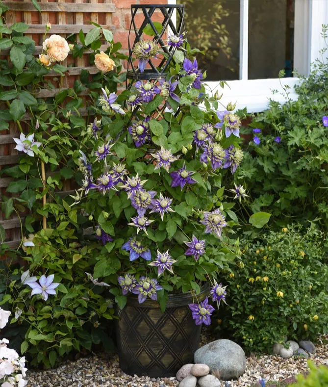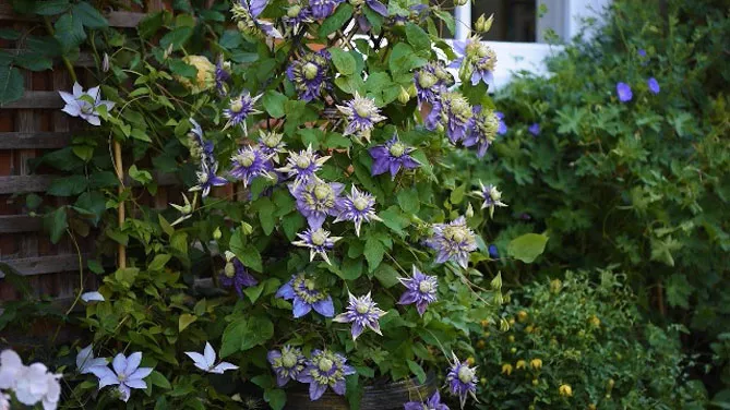 Фото. Клематис великоквітковий «Тайга» в ландшафтному дизайні
