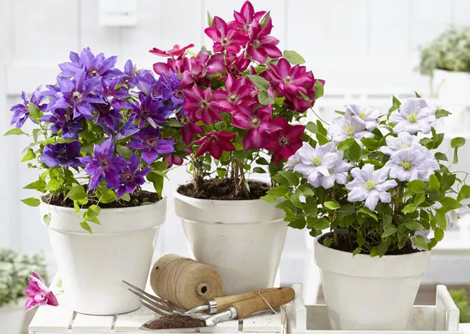 Клематиси відмінно ростуть в контейнерах, горщиках. Це відмінний спосіб краще захистити їх від холоду. Вирощування в горщиках не особливо складне. Клематис в горщиках буде трохи меншим, ніж той, що росте в землі. Він не зможе створити велику кореневу систему, однак в контейнерах легше забезпечити належні водні умови та вносити необхідну дозу добрива. Рослинам потрібні великі горщики – оптимально більше 30 см в діаметрі та 40 см у висоту. На дно горщика потрібно насипати дренаж, наприклад, трохи керамзиту, щоб коріння рослини не стояло у воді.